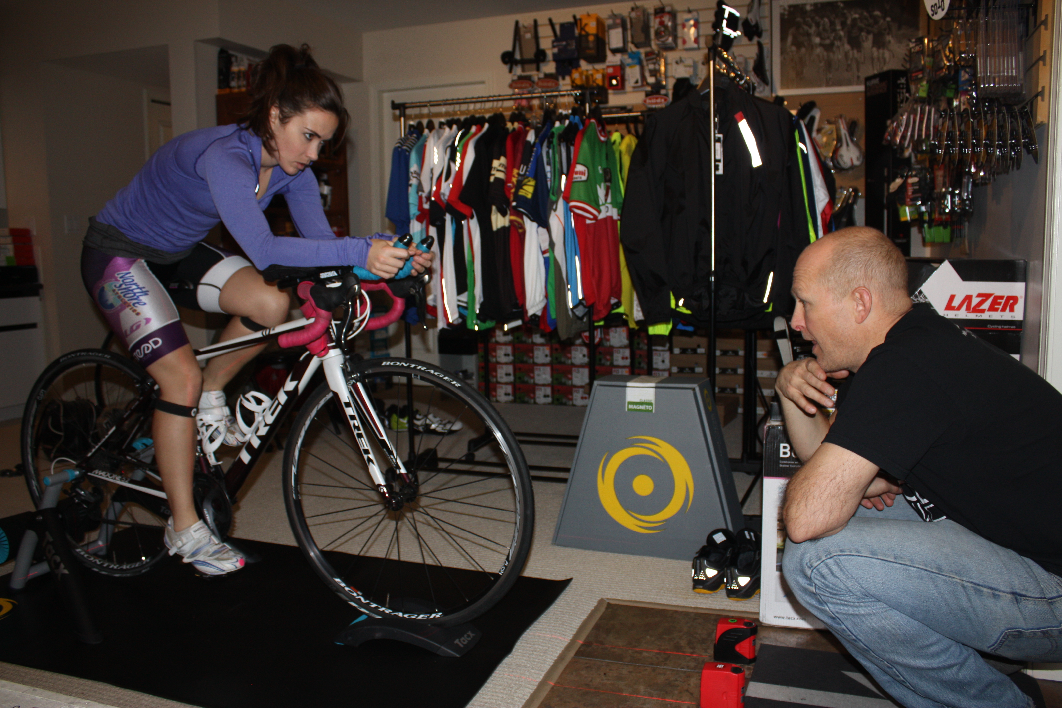 We went down to see Dave at North Shore Road Bike to begin the process of getting Jenna’s new position dialed on her bike. As always it was a great experience. He was very open to hearing my suggestions but more importantly he was very interested in Jenna’s feedback which is the most important part. He mounted Jenna’s tri bars and adjusted them to a width and angle that helped her feel relaxed. He removed some spacers out to drop her bar down and moved her saddle forward and to a height that was comfortable. Another thing that Dave did, which I found really interesting, was that he monitored whether Jenna’s knees were moving side to side during her pedal stroke. They were, so he suggested putting in a cleat wedge. This helped straighten her pedal stroke and should also help distribute the power in her pedal stroke more evenly across her foot. There’s a great read on cleat wedges by Dan Empfield from Slowtwitch here for those interested in learning more.