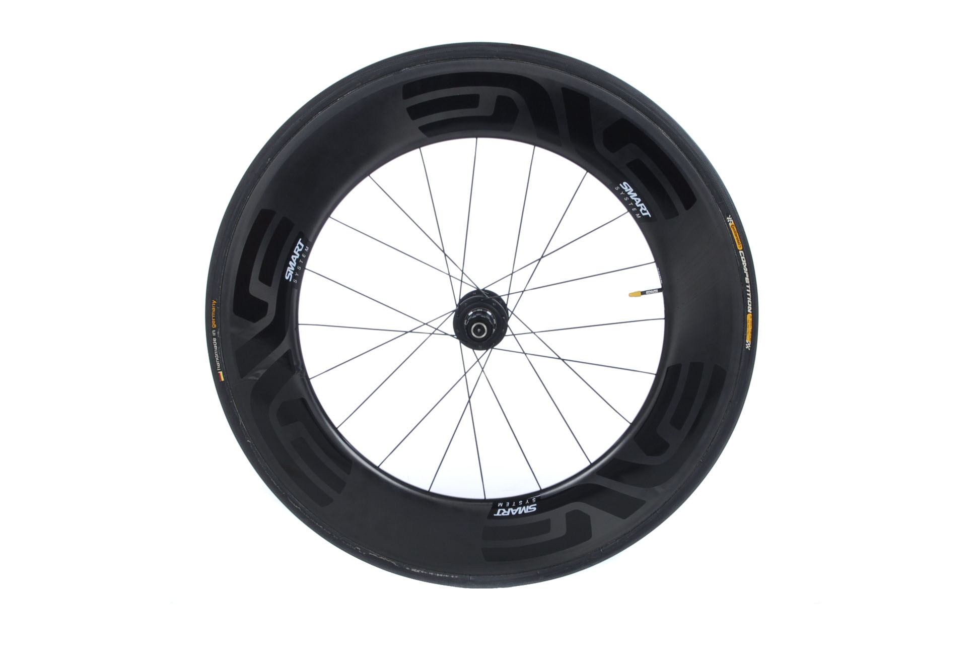 The rear wheel has a depth of 95mm and width of 24mm. We paired this with a 22mm Continental Competition tubular and built it around a Powertap G3 hub.